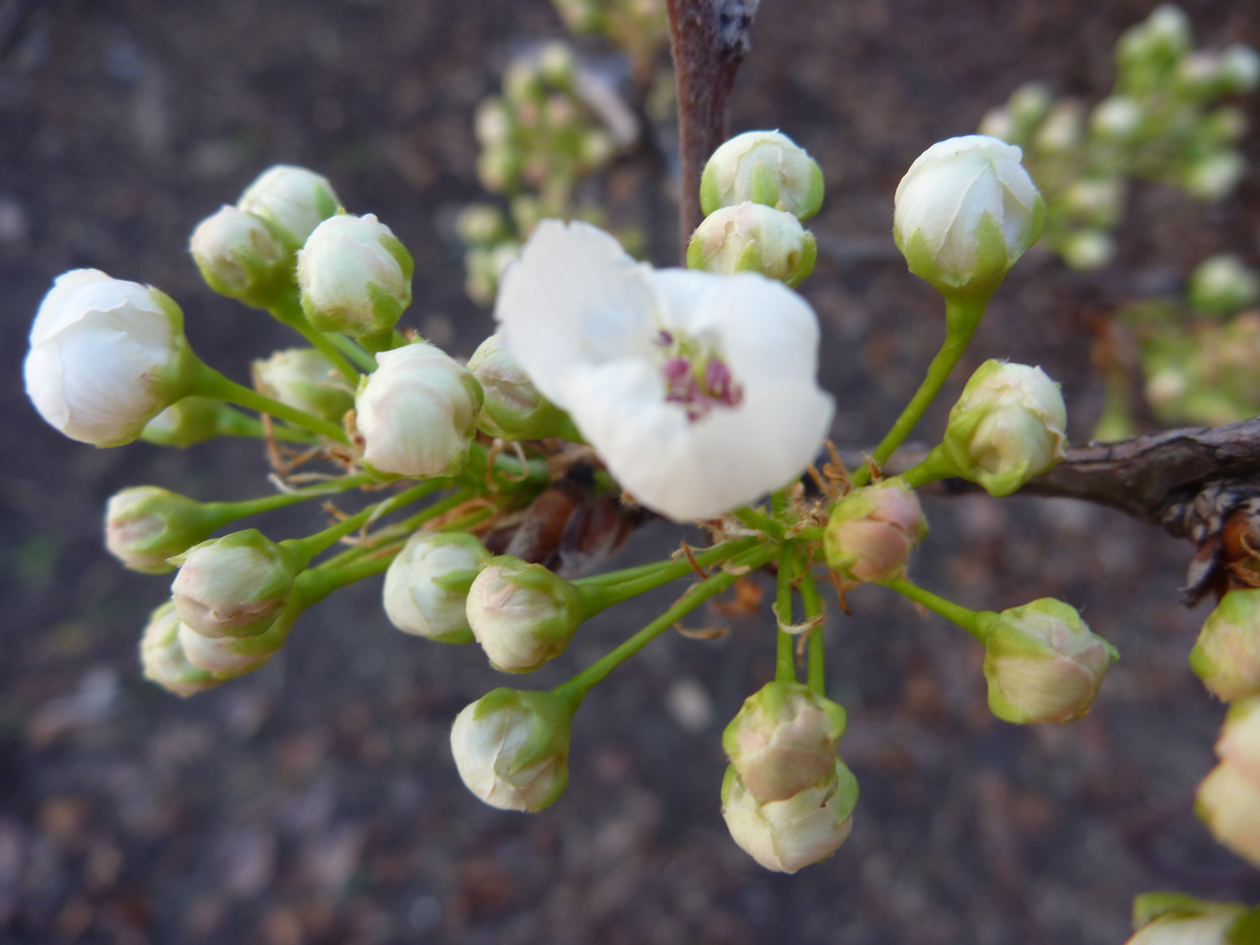 * ‘Aristocrat’ Pear — Next week, this tree will join its cousin, the Bradford, in transforming our winter-weary street into a bridal procession. Right now, it is covered in promising buds, and I can already detect its pungent odor. (Ornamental pear blossoms are best admired from inside a window to avoid the stench. 🙂 )