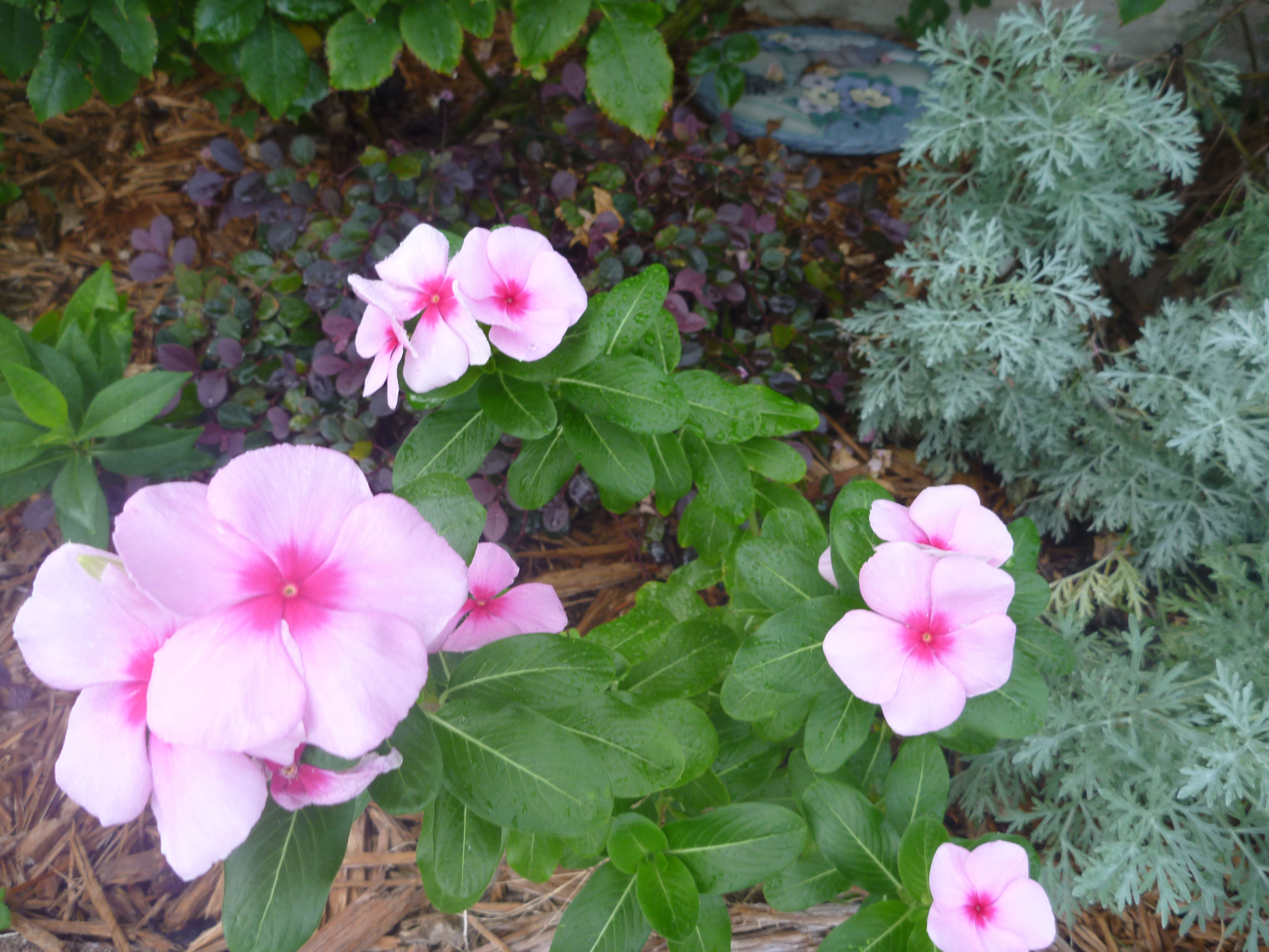 Near those roses in the front flower bed sits one of my favorite plant combinations: cheery vinca (pink), striking ‘Purple Pixie’ loropetalum (purple), and lacy ‘Powis Castle’ artemisia (silver).