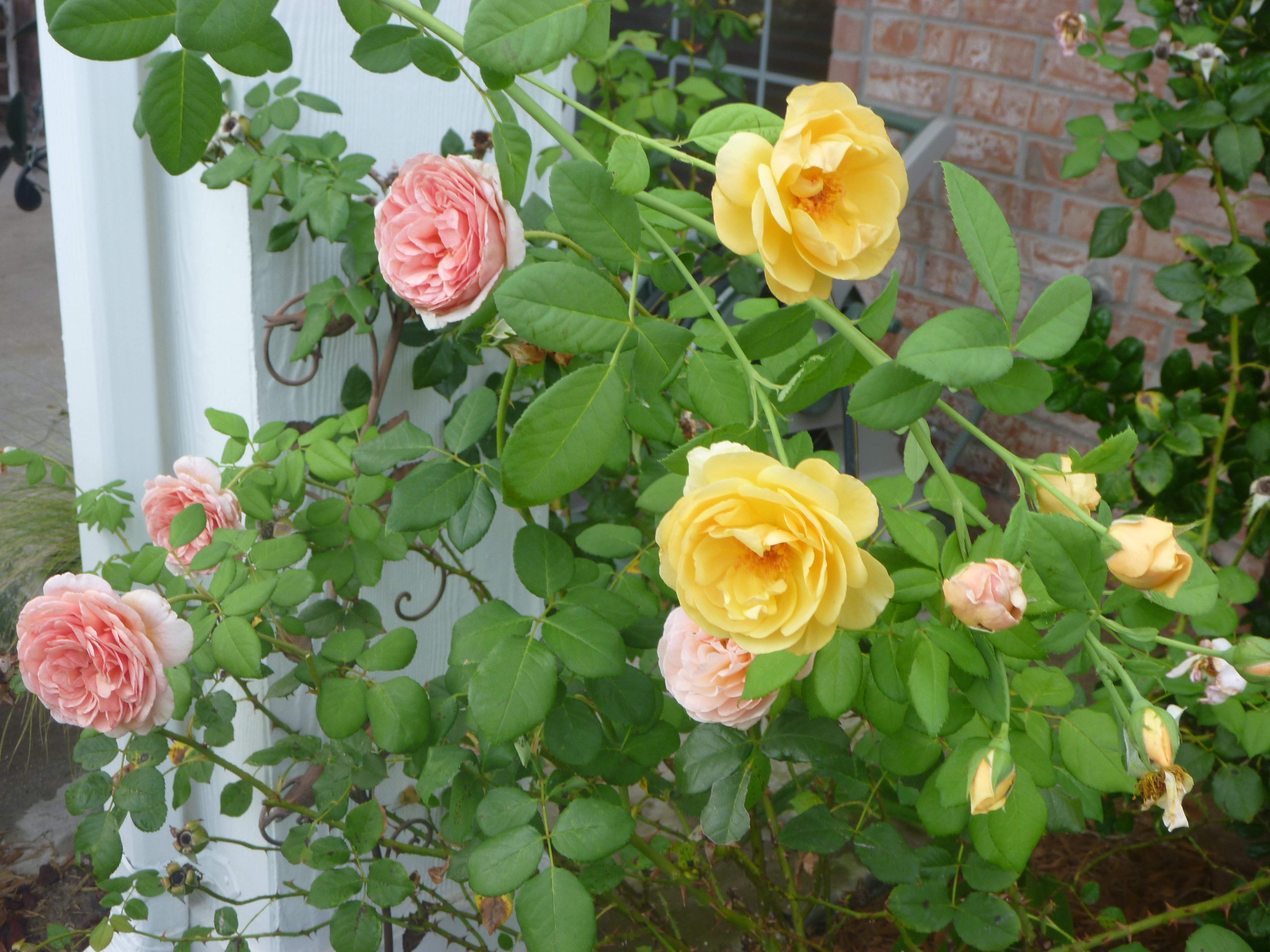 A spray of Graham Thomas (yellow) bent close to the lovely Abraham Darby rose (apricot). They looked as if they were whispering beautiful garden secrets.