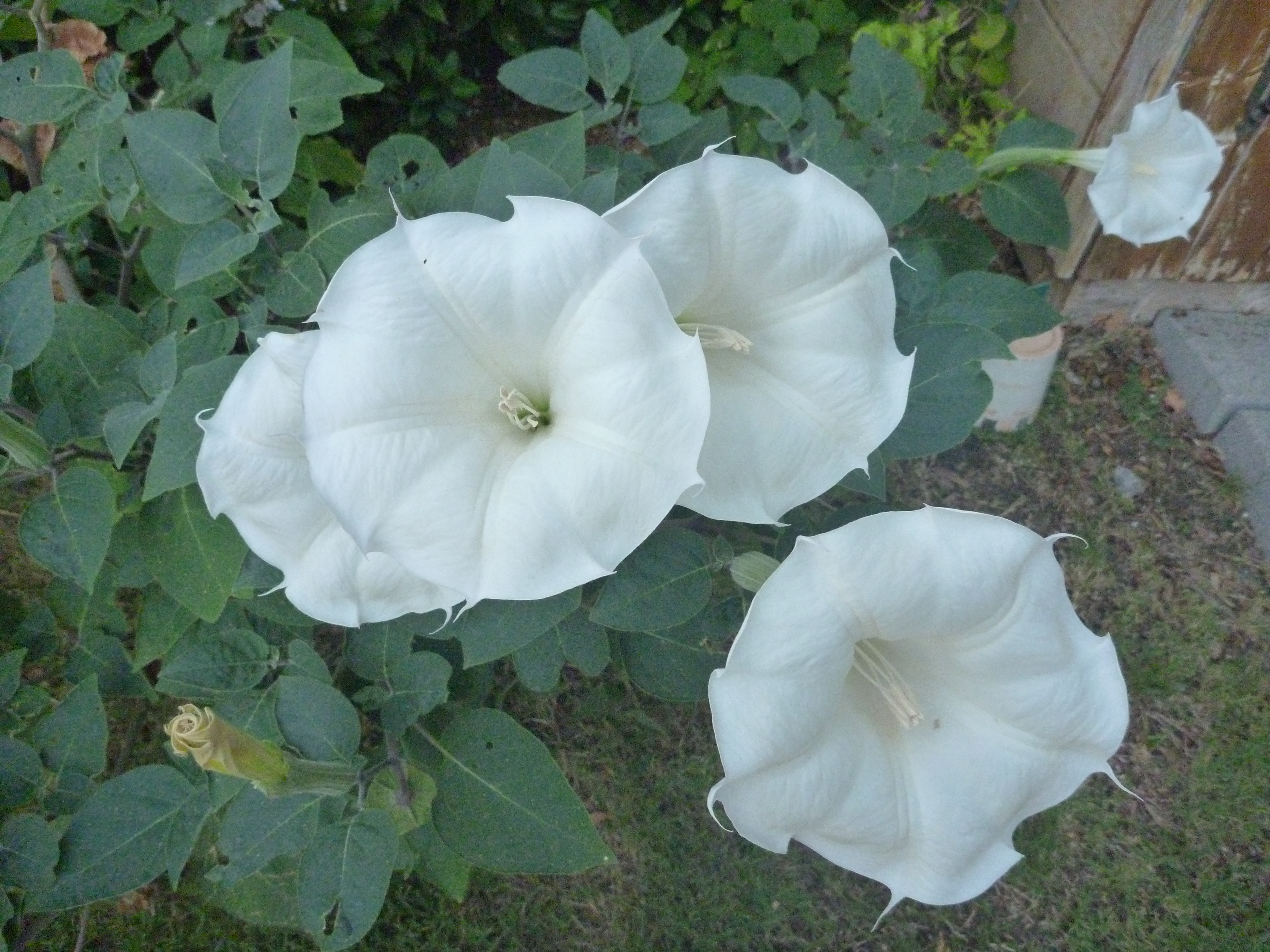 The datura has put on a show lately. Its large, petaled moons have beckoned me outside early in the morning to admire them before the bright sun bid them close.
